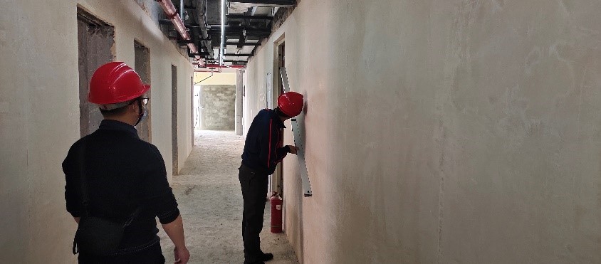 在施工樣板間中,龍湖總部工程師李壽燦親自測(cè)量墻面垂平度,測(cè)量結(jié)果質(zhì)量標(biāo)準(zhǔn)遠(yuǎn)遠(yuǎn)高于垂2平2,對(duì)藍(lán)花楹一體化施工質(zhì)量及效果贊不絕口,并表示考慮將龍湖冠寓項(xiàng)目試用藍(lán)花楹一體化施工。
