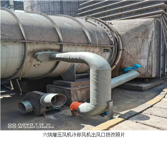 增壓風(fēng)機(jī)是煙氣脫硫系統(tǒng)的重要設(shè)備,一旦發(fā)生事故,將造成整個(gè)脫硫系統(tǒng)停運(yùn)。近期攀枝花天氣炎熱,三燒、六燒增壓風(fēng)機(jī)前軸溫度偏高,給生產(chǎn)穩(wěn)定運(yùn)行造成一定的風(fēng)險(xiǎn)。為了消除這個(gè)風(fēng)險(xiǎn),生產(chǎn)部組織檢修到現(xiàn)場進(jìn)行溝通、分析,打算在增壓風(fēng)機(jī)冷卻風(fēng)機(jī)出風(fēng)口利用備用的冷卻風(fēng)機(jī)將熱風(fēng)抽出,并匯入主煙道中,以此來加強(qiáng)冷風(fēng)的循環(huán),降低增壓風(fēng)機(jī)前軸的溫度。
