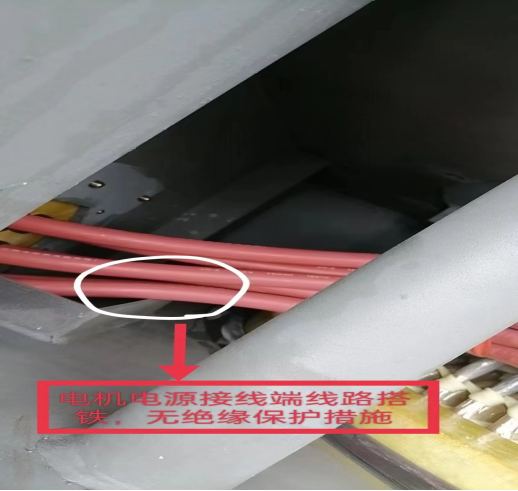 9月8日上午檢修電儀負責(zé)人周福和互保對子朱江華正常巡視到球團脫硝增壓風(fēng)機處時,施工人員正準備對風(fēng)機電機頂部進行封蓋。出于職業(yè)的本能反應(yīng),兩人快速對封蓋前的風(fēng)機電機內(nèi)部進行最后一次安全檢查,檢查發(fā)現(xiàn)風(fēng)機內(nèi)部兩處重大設(shè)備安全隱患。第一、高壓電機電源端線路直接緊靠在金屬棱角邊緣,風(fēng)機電機屬于高壓大功率設(shè)備,在運行中受到煙氣流量流速,壓力喘振等因素會產(chǎn)生振動,如果電源線不進行絕緣處理長時間運行,會導(dǎo)致絕緣外皮破損產(chǎn)生搭鐵短路放炮事故。