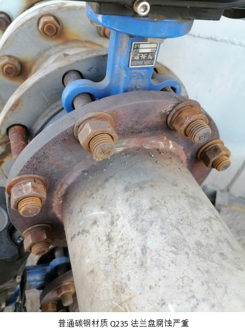 西昌藍鼎一、二期脫硫脫硝系統(tǒng)已經(jīng)連續(xù)運行了兩年,脫硫脫硝出口指標達到國家超低排放標準。但是部份機電設備腐蝕嚴重,比如主副塔的除霧器沖洗水管道法蘭盤材質(zhì)為普通碳鋼Q235,有部分法蘭盤已經(jīng)出現(xiàn)漏水故障,水噴到電機上可能將電機燒壞,跑冒滴漏也會被罰款,存在安全隱患。