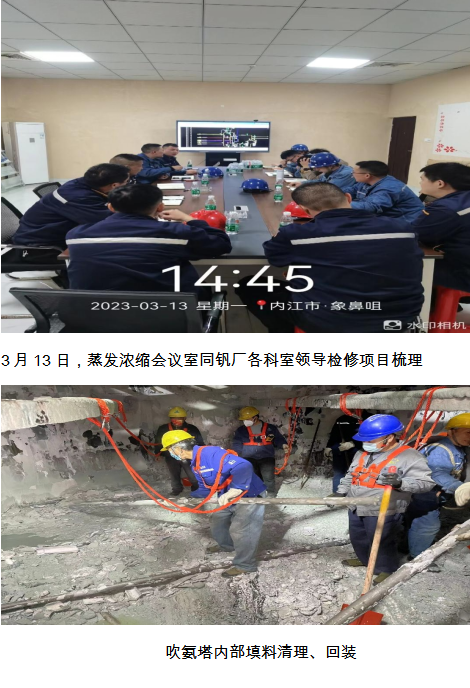 威遠藍鼎提釩廢水處理和蒸發(fā)濃縮項目,自去年10月份停機大修至今已有近半年時間。運行過程中水處理吹氨塔填料堵塞漏蒸汽,蒸發(fā)濃縮各單元設備故障明顯增加,影響系統(tǒng)運行。威遠藍鼎在釩廠回轉窯大修期間,提前消減廢水庫存至3000m3以下,避免廢水外送高爐。3月13日威遠藍鼎副總經(jīng)理黃安軍、副部長楊平、宋雨鵬在蒸發(fā)濃縮會議室組織釩廠各科室開展檢修協(xié)調會,告知釩廠相關領導本次檢修項目的重點、難點、風險點,為水處理爭取充足的檢修時間。