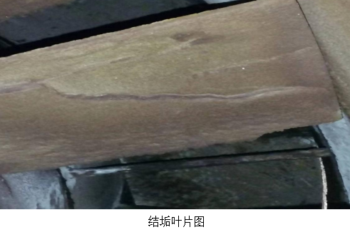 由于諸多問題處理存在交叉干擾,對于增壓風(fēng)機(jī)的處理放在了最后時段,當(dāng)日17:30 風(fēng)機(jī)停止運行,經(jīng)檢查發(fā)現(xiàn)風(fēng)機(jī)葉片結(jié)垢(質(zhì)地堅硬的NH4HSO4晶體,其硬度估算為25R以上)相當(dāng)嚴(yán)重,如果采取揭蓋方式處理至少還需要10h以上才能完成(超出預(yù)定時間4h),隨后孫小剛副總經(jīng)理和王建勇部長實地觀察分析后召集檢修班召開現(xiàn)場研討會,在保證不超時又必須處理的背景下果斷決定嘗試?yán)孟窜嚈C(jī)對風(fēng)機(jī)葉片(共25葉)進(jìn)行沖洗檢修。由于風(fēng)機(jī)輪轂位置空間相當(dāng)狹窄,檢修人員需強忍高壓水沖洗時的大量酸性水溶液噴濺于面部的巨大困難連續(xù)輪番作業(yè)5小時,于23:30完成檢修任務(wù),處理的結(jié)垢物質(zhì)估算150Kg左右(風(fēng)機(jī)葉輪動平衡指標(biāo)一般為:偏心量50g以下)。經(jīng)增壓風(fēng)機(jī)啟機(jī)運行24h后發(fā)現(xiàn)諸振動值正常(最高值<1.2,幾乎與新風(fēng)機(jī)同等),完成了幾乎不可能完成的任務(wù),在線檢修取得圓滿成功!