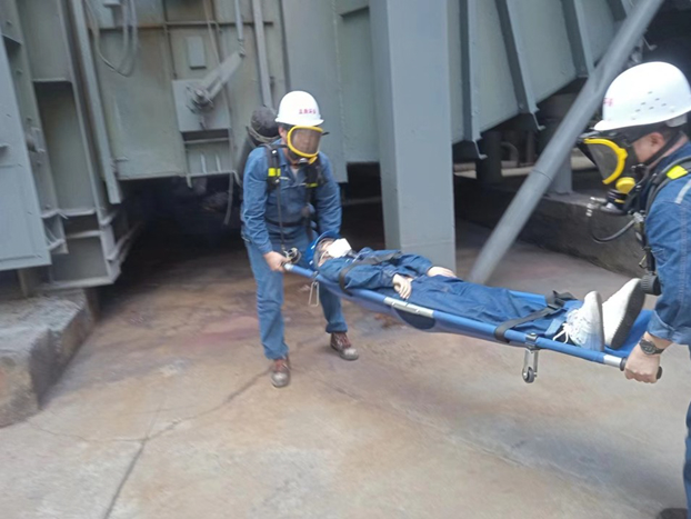應(yīng)急演練開始,安全員趙開寶對本次演練內(nèi)容進(jìn)行了講解,并對參與本次演練的員工進(jìn)行了分工。本次演練內(nèi)容為:3燒脫硫系統(tǒng)運行中,進(jìn)口煙道附近巡檢人員巡檢時發(fā)現(xiàn)有1名人員暈倒在煙道附近,同時煙道底部有白色煙霧漏出,懷疑是發(fā)生二氧化硫中毒,隨即向當(dāng)班班長匯報。當(dāng)班班長在1分鐘內(nèi)通知生產(chǎn)部相關(guān)負(fù)責(zé)人,同時聯(lián)系燒結(jié)機對抽煙機及脫硝風(fēng)量進(jìn)行調(diào)整加大煙道負(fù)壓減少泄漏源,立即組織現(xiàn)場人員對泄漏50米范圍內(nèi)進(jìn)行警戒隔離防止無關(guān)人員進(jìn)入泄漏區(qū)域;并立即組織2名應(yīng)急救援人員穿戴好空氣呼吸器進(jìn)入事故現(xiàn)場進(jìn)行施救,救援人員來到現(xiàn)場后在1分鐘內(nèi)穿戴好空氣呼吸器進(jìn)入泄漏區(qū)域用擔(dān)架將暈倒的人員轉(zhuǎn)移到人孔外,被救出的人員呼吸正常,意識清醒,出現(xiàn)身體乏力伴有嘔吐情況,經(jīng)過周邊空氣檢測,靠近煙道口附近溫度比較高,且發(fā)現(xiàn)一處煙道漏點,附近氣流不通暢,二氧化硫超標(biāo),隨即對人員補充水分并安置在通暢處歇息,安排急救車送往醫(yī)院。生產(chǎn)部管理人員對現(xiàn)場實際情況作出初步判斷,同時檢修人員穿戴空呼對漏點處進(jìn)行焊補。