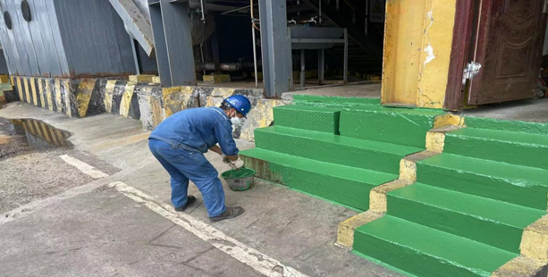 工作開(kāi)展之前,安全員陳江嚴(yán)格按照安全環(huán)保管理要求,對(duì)防腐刷漆工作中可能存在的高空墜落、油漆飛濺等危險(xiǎn)因素詳細(xì)辨識(shí),根據(jù)實(shí)際需要配備安全帶、防護(hù)面罩、警戒帶等防護(hù)器具,現(xiàn)場(chǎng)講解安全防范措施,按照班前會(huì)流程進(jìn)行安全宣貫。廠(chǎng)區(qū)刷漆的同時(shí),廠(chǎng)區(qū)道路兩旁的道沿也受到了特別“呵護(hù)”:水處理生產(chǎn)班組自行組成刷漆小分隊(duì),在蒸發(fā)全廠(chǎng)范圍開(kāi)展了“亮化廠(chǎng)區(qū)環(huán)境,提升廠(chǎng)容廠(chǎng)貌”道路沿石警戒線(xiàn)義務(wù)刷漆。生產(chǎn)班組采用黃黑相間油漆粉刷,對(duì)全廠(chǎng)所有道路沿石進(jìn)行刷漆。本次刷漆百分百覆蓋廠(chǎng)區(qū)道路沿線(xiàn),共計(jì)約300多米。