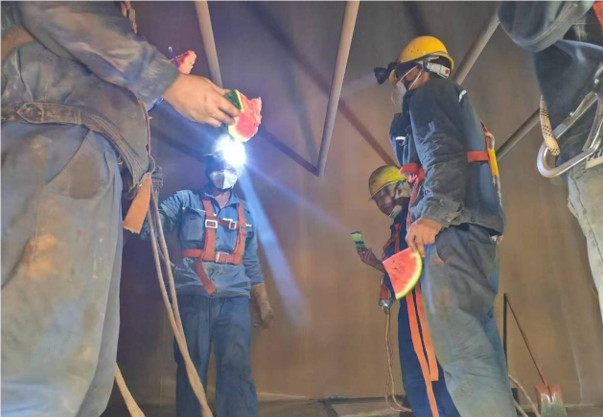 8月13日,球團脫硫脫硝系統(tǒng)定期檢修,檢修工作地點多數(shù)在室外,高溫天氣和高強度工作量更是加大了人員中暑的風(fēng)險。下午4點氣溫達到了33度,后勤人員帶著切好的冰凍西瓜來到檢修現(xiàn)場,把清涼送到每個區(qū)域,也送到了39米高的濕電頂部。