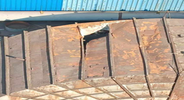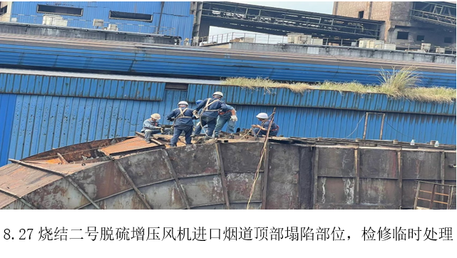 8月27日,檢修員在巡檢時發(fā)現(xiàn)并上報了燒結(jié)二號脫硫增壓風機進口煙道頂部約27㎥鋼板出現(xiàn)塌陷,威遠藍鼎生產(chǎn)部高度重視,立即將風險隱患上報燒結(jié)廠部領(lǐng)導(dǎo),協(xié)商時間處理。當天廠部協(xié)商停機4小時對脫落部位進行臨時加固處理。8月28日,廠部利用高溫限電停機11小時,對二號燒結(jié)進口煙道頂部脫落位置進行全面檢修。