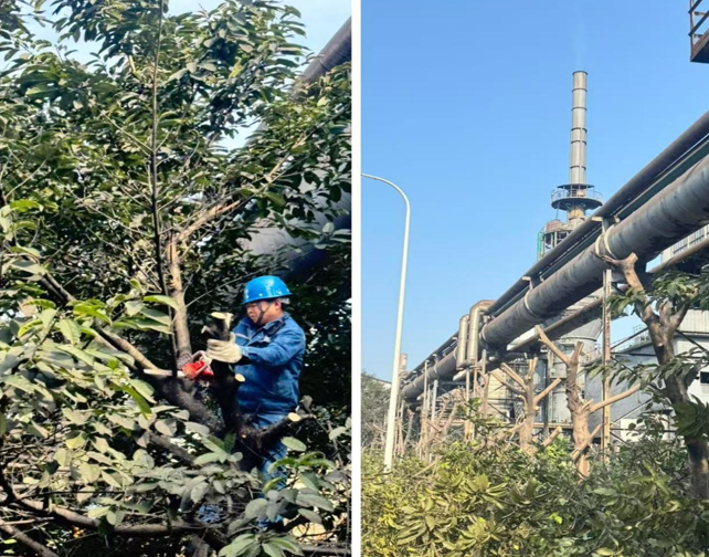 隨著季節(jié)更替,干熄焦脫硫區(qū)域內(nèi)樹木枝干生長繁茂,部分高大樹枝已延伸至生產(chǎn)煤氣管道上方、電氣線路周邊,且部分枯枝、病枝存在倒伏、墜落風(fēng)險(xiǎn)。這不僅可能損壞煤氣管網(wǎng)、照明線路,影響正常生產(chǎn)作業(yè)秩序,還會(huì)給員工日常巡檢、通行帶來安全隱患。為及時(shí)消除風(fēng)險(xiǎn),威遠(yuǎn)澤天生產(chǎn)部部長黃安軍高度重視,迅速制定修剪方案,明確修剪范圍、作業(yè)標(biāo)準(zhǔn)及安全注意事項(xiàng),由脫硫乙班組長雷波帶領(lǐng)小組成員有序推進(jìn)樹枝修剪工作。