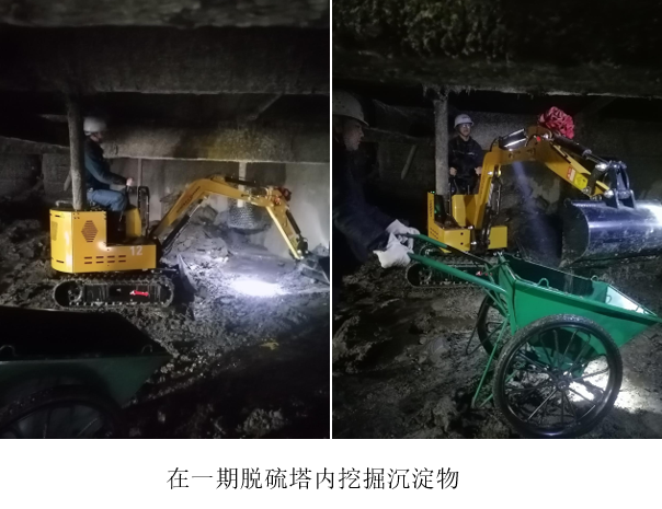 1月27日,西昌藍(lán)鼎在一期脫硫塔維護(hù)工作中引入微型挖掘機(jī),成功攻克了長期困擾脫硫塔底部沉淀物清理的難題。